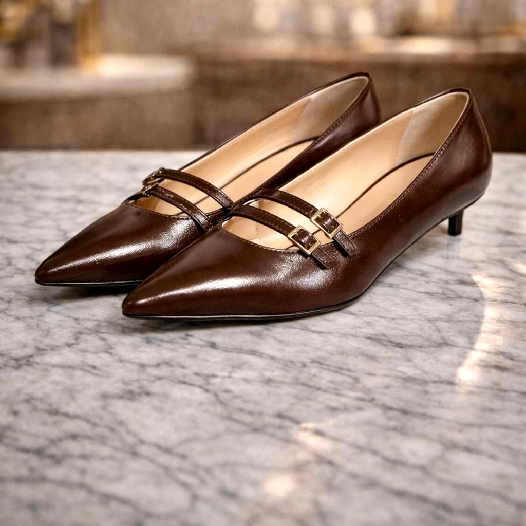 Les escarpins ROMY sont une pièce élégante et féminine de la garde-robe. Leur cuir marron profond apporte une allure sophistiquée tandis que la forme pointue affine naturellement la silhouette du pied. Les fines brides sur le dessus ajoutent une touche délicate et moderne, soulignée par une boucle métallique discrète.
